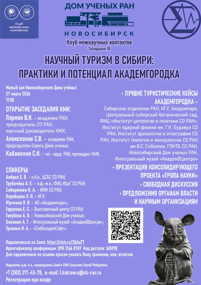27 марта 2026 г. в Малом зале Дома ученых РАН в Новосибирске пройдет очередное заседание Клуба межнаучных контактов СО РАН